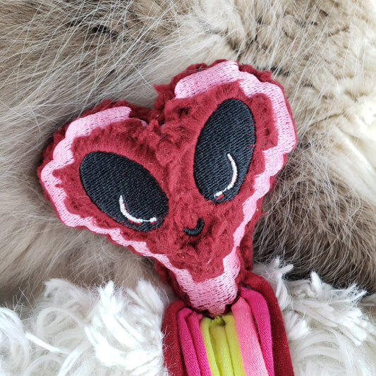 Crafted with the finest organic catnip, toughest fleece, and vibrant embroidered colors, these toys are designed to captivate your kitty's imagination. Watch as your cat embarks on a cosmic adventure, batting, pouncing, and chasing this playful alien invader.