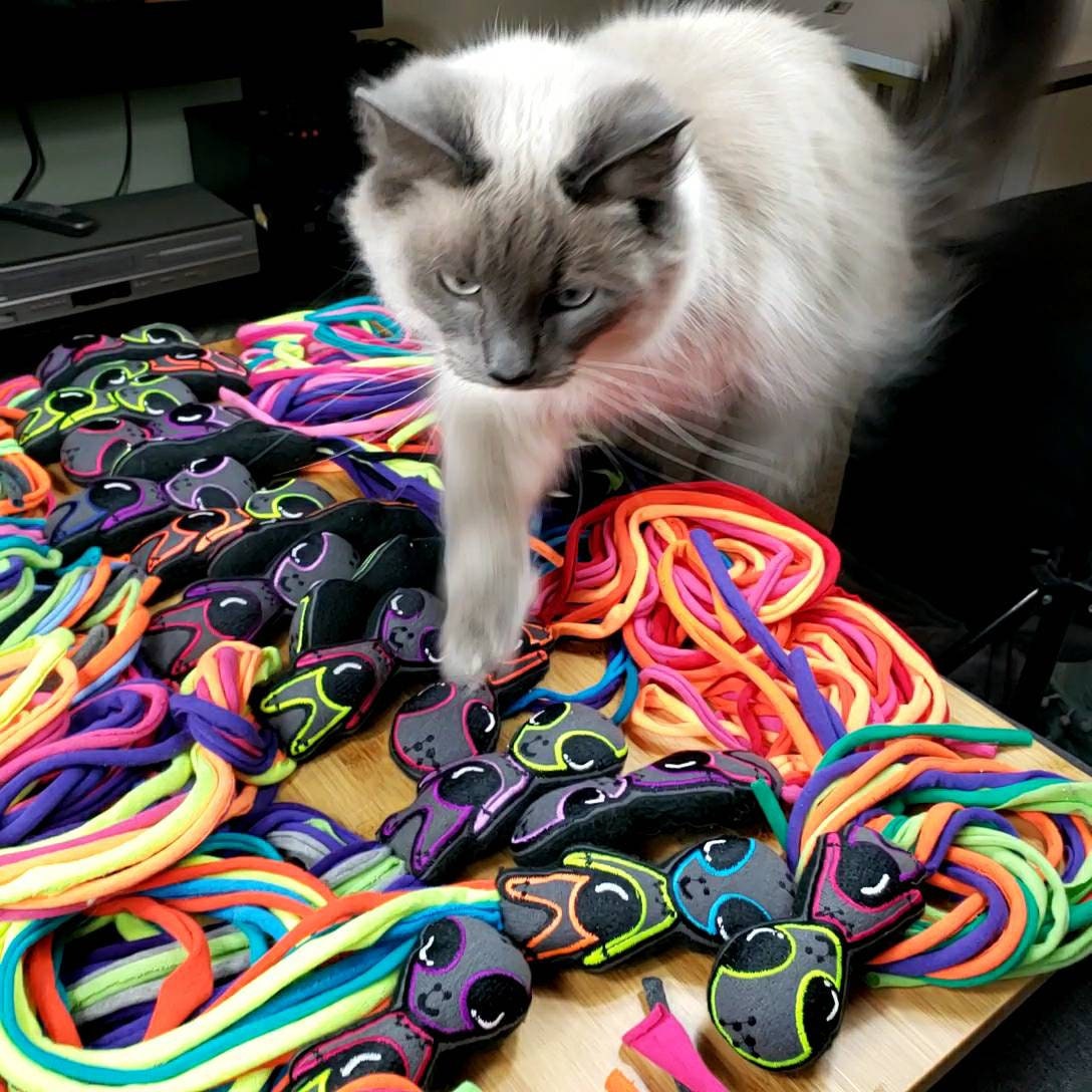 Every toy is sewn in our very own shop, stuffed to order with premium catnip, and hand-finished with springy, cotton jersey tails that measure up to 36 inches long! Your Kitty will love these super interactive and fun toys, prepare for some spaced-out cats!!! Each cat toy is made by me, Rachel from Cinci Made Embroidery (check us out for your human stuff! www.etsy.com/shop/CinciMadeEmbroidery )