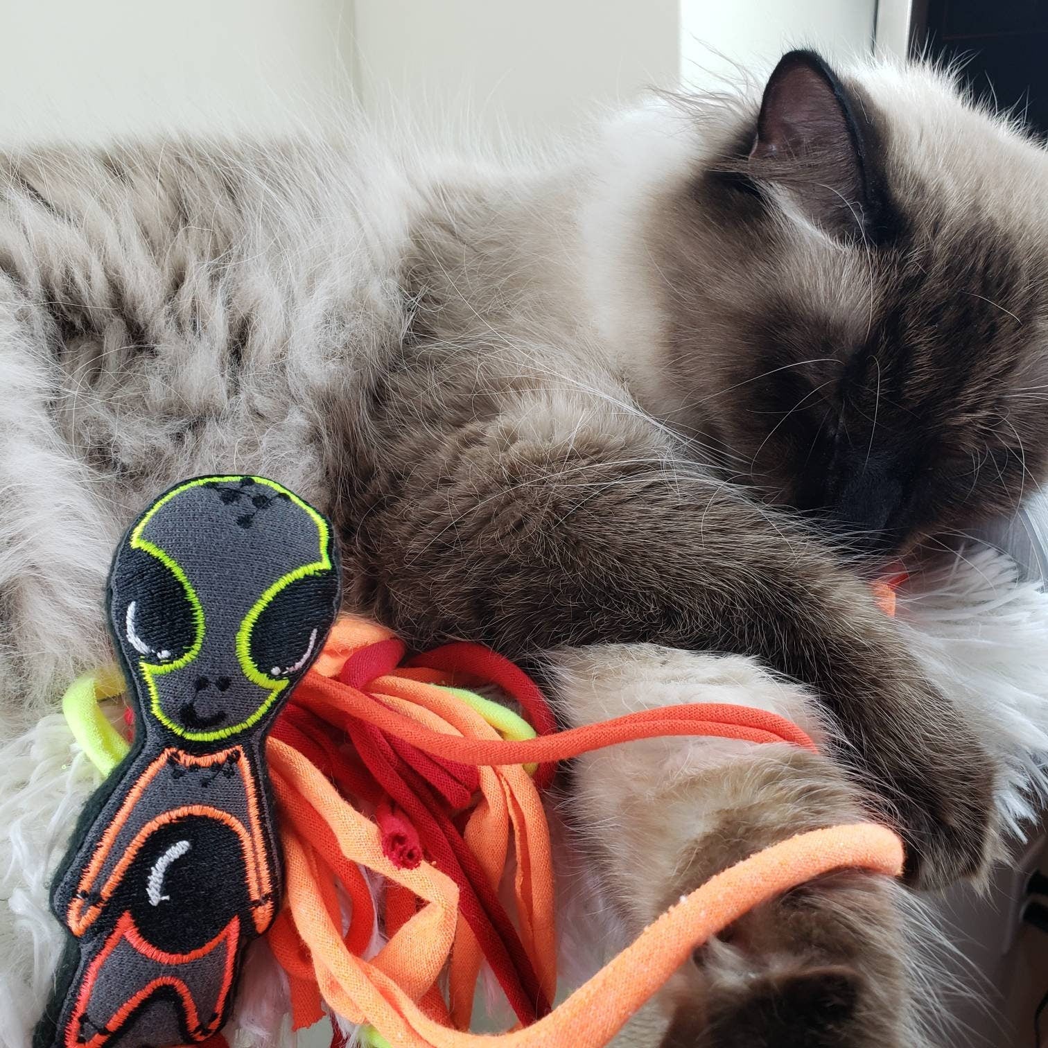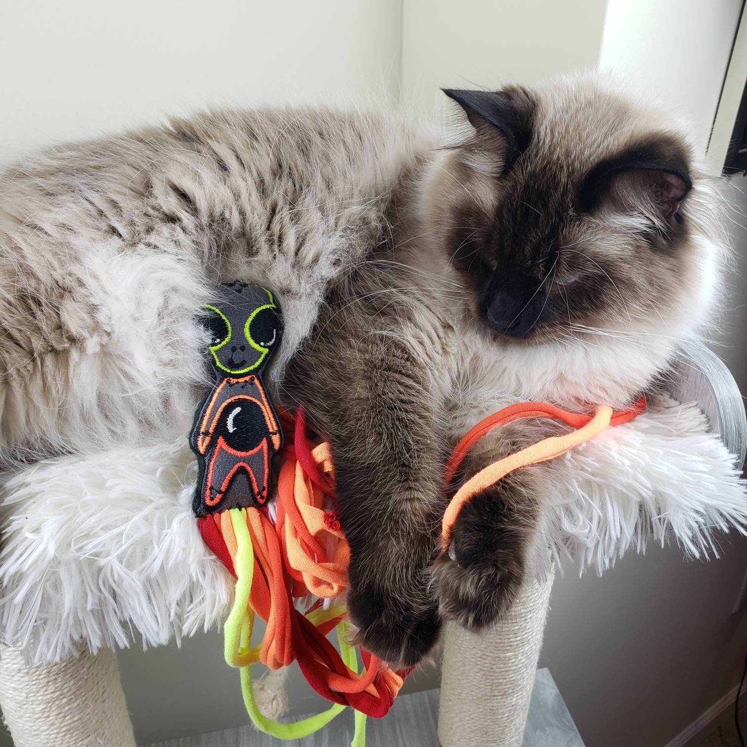 One Fiery Neon Alien and Meteor Catnip Toy. Embroidered with bright neon threads in yellow, orange, and red. These toys are then stuffed with catnip and finished with springy, cotton jersey tails that measure up to 36 inches long! Your Kitty will love these super interactive and fun toys. Prepare for some spaced out cats!! Each cat toy is embroidered by me at a family-owned apparel shop in Ohio! Thanks for checking out my shop!
