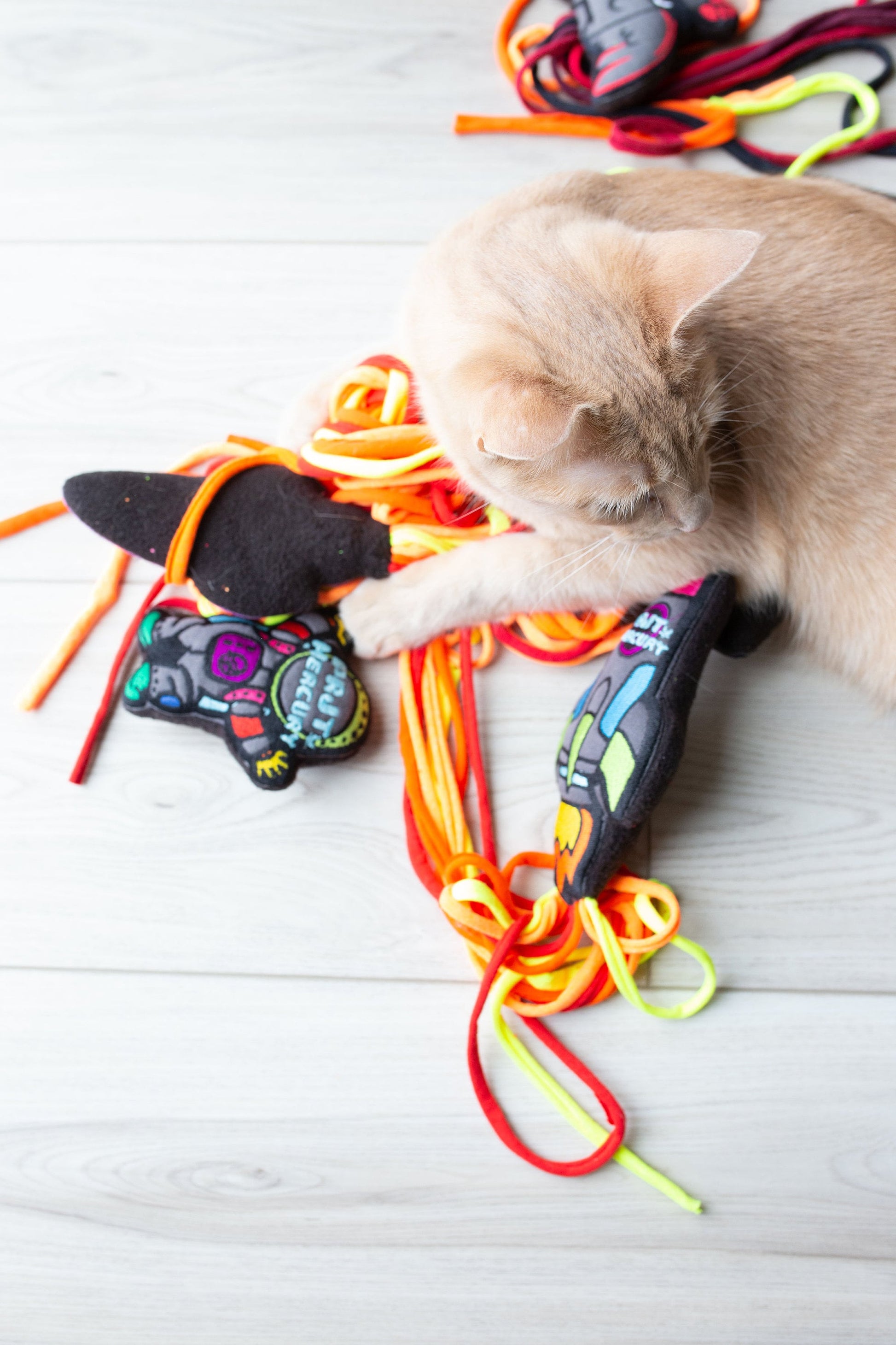 Every toy is sewn in our very own shop, stuffed to order with premium catnip, and hand-finished with springy, cotton jersey tails that measure up to 36 inches long! Your Kitty will love these super interactive and fun toys, prepare for some spaced out cats!!! Each cat toy is made by me, Rachel from Cinci Made Embroidery (check us out for your human stuff! www.etsy.com/shop/CinciMadeEmbroidery )
